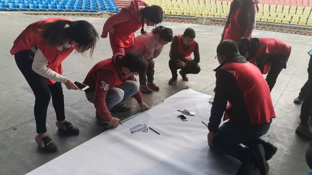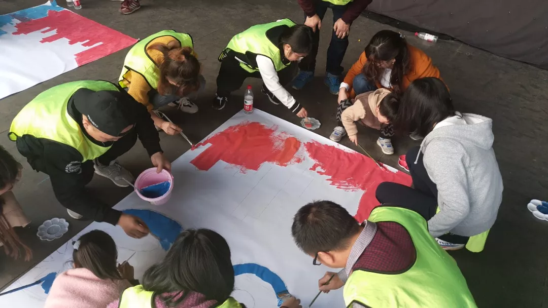 此次團建的最后一項活動---為準備好的“九捷2019加油”巨幅畫布描色。巨幅畫布被分為四等分,每組負責一小塊,計算比例大小,調色,上色,盡管在活動執行的時候,對于巨畫下筆有些迷茫,但卻都朝著正確的方向前進著。
